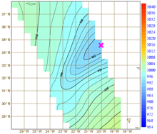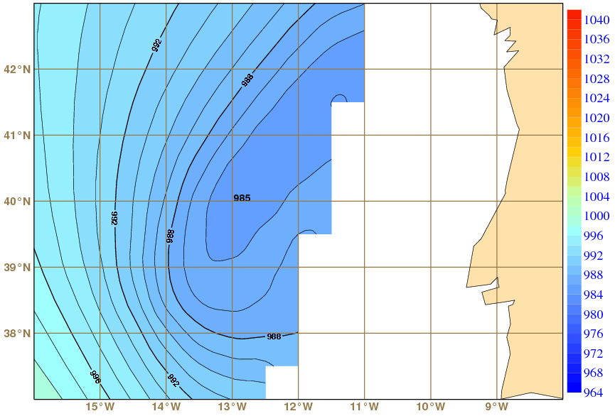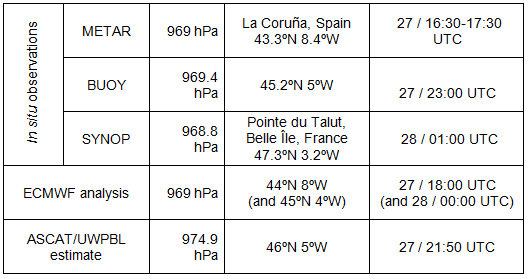 - The pressure minimum of 985 hPa by ASCAT/UWPBL suggests a clear overestimation by this algorithm, when comparing to the minimum pressure estimated through surface observations around 970 hPa (ECMWF MSLP 9h forecast for 09:00 UTC indicated 971 hPa at approximately 38°N 14°W and in the 12:00 UTC analysis it reached a minimum of 973 hPa). This overestimation by ASCAT/UWPBL can be either related to the boundary model characteristics or to a possible underestimation of wind speed by ASCAT. This may suggest the real wind to be stronger than Beaufort 9. Remember though that ASCAT still has a reliable range up to 50 kt (Beaufort 10), excluding wind speeds corresponding to Beaufort 11 and 12.