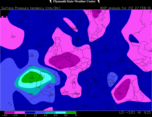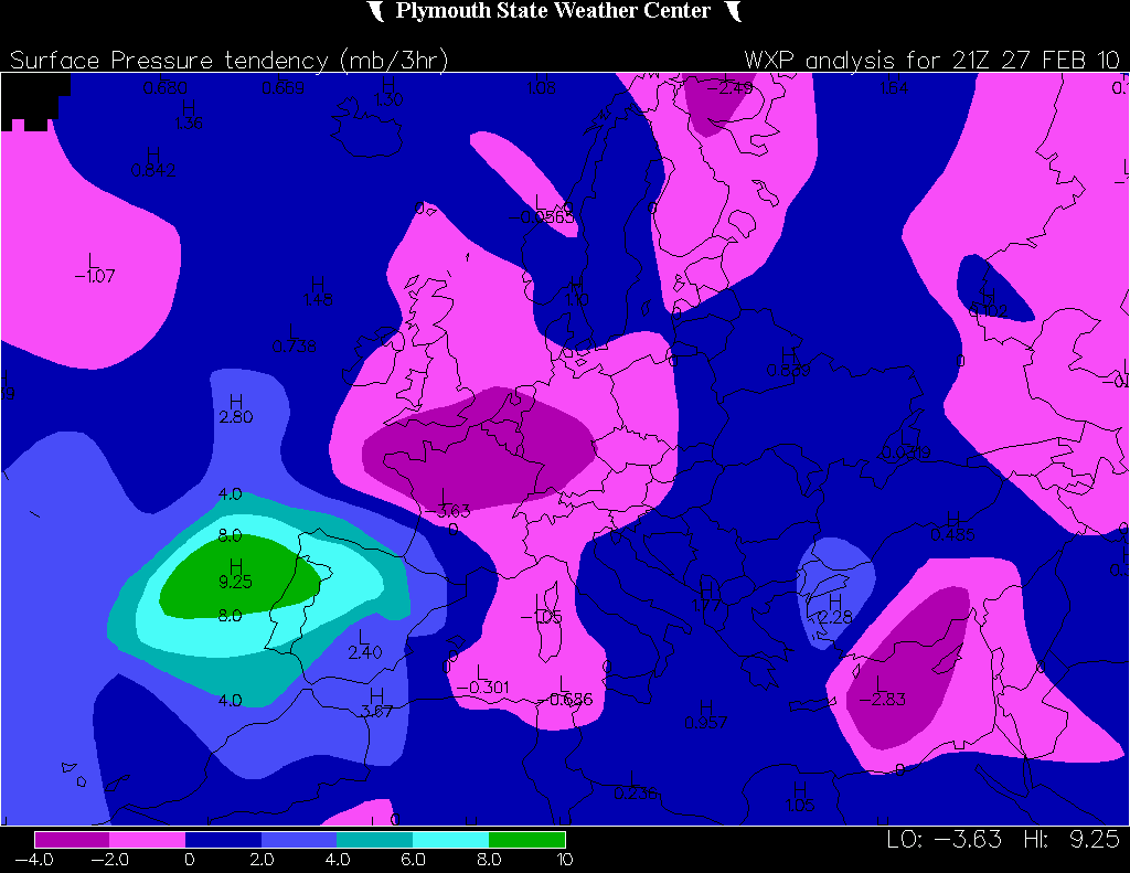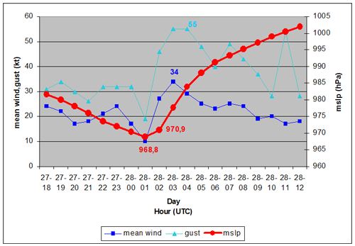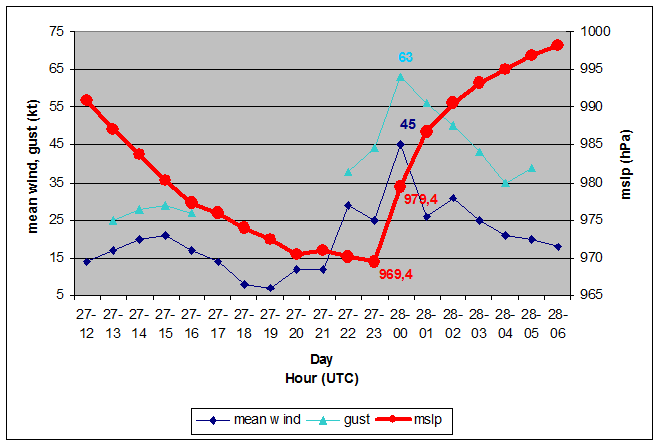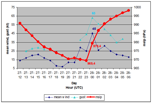Since its genesis, Xynthia has shown an almost permanent surface pressure tendency dipole along its trajectory. In fact, not only did pressure drop very quickly but it also rose very quickly behind the storm. This could be seen very clearly at 21:00 UTC on the 27th (Figure 2.6.3). In its northeast trajectory across the Bay of Biscay, Xynthia's centre passed slightly to the north of the buoy located at 42.5°N 5°W, which had a minimum surface pressure of 969.4 hPa at 23:00 UTC and an intense pressure rise of 10 hPa in the following hour (Figure 2.6.4).