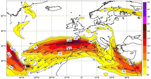 ECMWF analysis suggested 985 hPa at 34°N 19°W at 00:00 UTC on the 27th (Figure 2.4.6) and a drift buoy reported 986 hPa around 37°N 16°W which suggests another minimum further northeast. The model outputs show Xynthia with well defined frontal characteristics (note how the Thermal Front Parameter exceeds the colour-coded scale in Figure 2.4.6) related to strong temperature advections both on the warm and cold sides. The frontal patterns from the model analysis do not disagree with the subjetive analysis based exclusively on ASCAT winds (Figure 2.4.2).