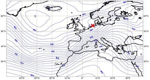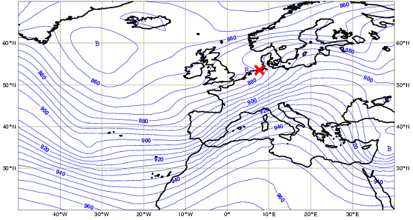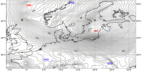 ECMWF forecasts after 25th February were all indicating a low-pressure system over the Baltic Sea area at this time. Remember that by the 25th the precursor disturbance that later become Xynthia was already present over a subtropical area of the North Atlantic and could be assimilated by the models. After the 25th, the minimum sea level pressure forecasts for the depression at 9:00 UTC on 1st March ranged from 978 to 988 hPa (10 hPa spread), depending on the run, while the surface observations suggested a minimum pressure of 982 hPa at that time. According to the forecasts since the 25th, three countries could have reclaimed the location of the low at this instant, as it changed in a box with 5° longitude and 2.5° latitude: