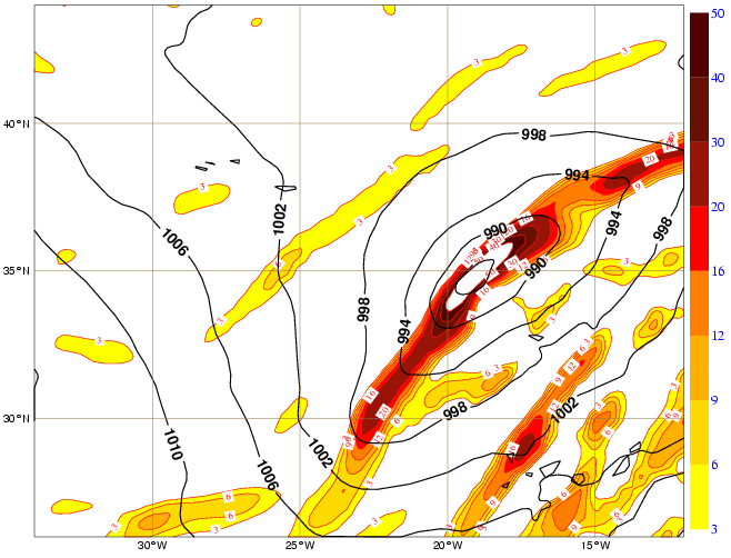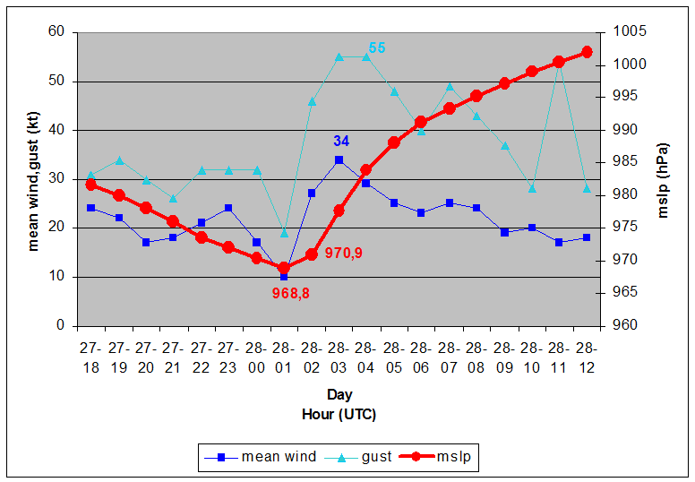Xynthia passed northwest of the Madeira Islands overnight as a deep storm. Surface observations from the Madeira archipelago recorded high wind gusts, reaching 145 km/h (78.4 kt) at the mountain station of Areeiro (1590m) at 23:30 UTC on 26th, and an hourly precipitation maximum of 15.6 mm between 03:00 and 04:00 UTC on the 27th (and 56.2 mm in 6 hours, between 00:00 and 06:00 UTC). However, these precipitation amounts are not totally unusual in the mountains of Madeira, and therefore not as high as one might expect, taking into consideration the air mass involved, the direction of flow and the topography of the main island. In a way, Xynhtia was starting to reveal itself to be more a wind storm rather than a precipitation storm.