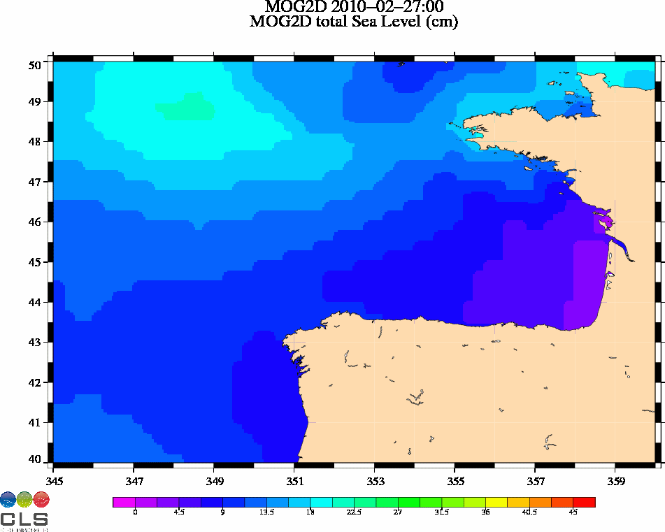 At 21:00 UTC Xynthia was again over the sea, with subjective surface analysis from available surface observations (SYNOP, SHIP and BUOY) suggesting a centre around 45°N 5°W with an MSLP value of 970 hPa or lower. However, the elongated shape of the MSLP field analysis over the Bay of Biscay, with a small trough stretching east-northeastwards, could suggest either the possibility of two centres or a frontal trough.