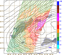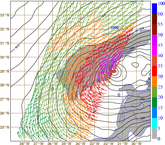 At this stage ASCAT measured winds in the 30-35 kt range to the north and south of the system (Figure 2.2.1), that is Beaufort 7 to 8 (near gale to gale). In fact, in the southeast border of the storm centre ASCAT wind was even reaching the 37.5-42.5 kt range (Beaufort 8 to 9, gale to strong gale). Taking into account these wind speed values, if this storm were to be considered of tropical nature, being below 30°N, it would already be reaching tropical storm intensity. The ECMWF wind analysis at 00:00 UTC was practically coincident with the ASCAT pass. Therefore, ASCAT data were likely to have been assimilated into this ECMWF model run. The ECMWF analysis reproduced winds reaching 30 kt on both the north and south areas referred above, but nevertheless missed the narrow region of strong gale winds (Figure 2.2.3, left).