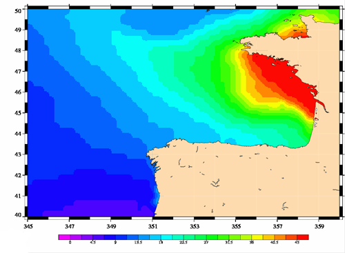 The pressure drop over the Bay of Biscay produced a strong storm surge on the coasts of Spain and France. An example of such a storm surge was depicted by MOG2D model output, which suggested a maximum sea level rise of 85 cm (Figure 2.6.6). In fact, the tide gauge of La Rochelle (Charente-Maritime Department) in France recorded a tide height of 8.01 m that corresponded to a storm surge of 1.53 m, resulting both from low surface pressure and high wind speeds. This storm surge height was not only the highest ever recorded since the instrument was installed in 1997, but was also higher than any height recorded in the Brest tide gauge (also on the French coast) in 150 years. The storm surge produced an extreme and vast flooding event in the coastal areas of the Charente-Maritime and Vendée Departments, which resulted in at least 53 casualties in France alone.