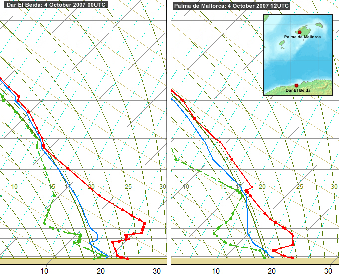 The source of the EML can be traced back and confirmed by checking the sounding from Dar El Beida in Algeria. The sounding for 4th october at 00 UTC, confirms that the EML found in Mallorca at 12UTC is advected by a southerly and mid-level flow which is directed towards the Balearic Islands.