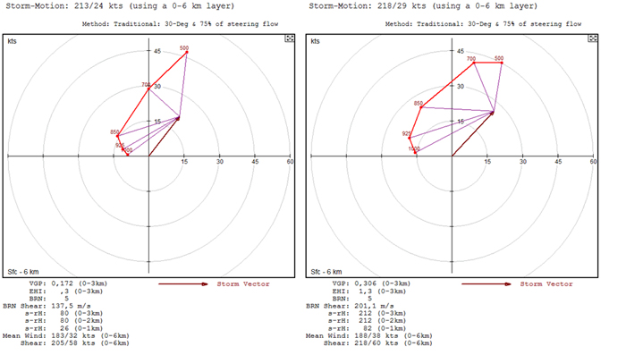 For convective parameters computation, a storm motion vector has to be adopted, and here we follow the traditional approach, so the storm is supposed to move with 75% of mean flow speed and 30° to its right, which is not very realistic in this case, because our MCS, by 15 UTC, did not move to the right of the mean flow, even did not moved at the forecasted speed, but markedly faster.