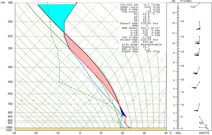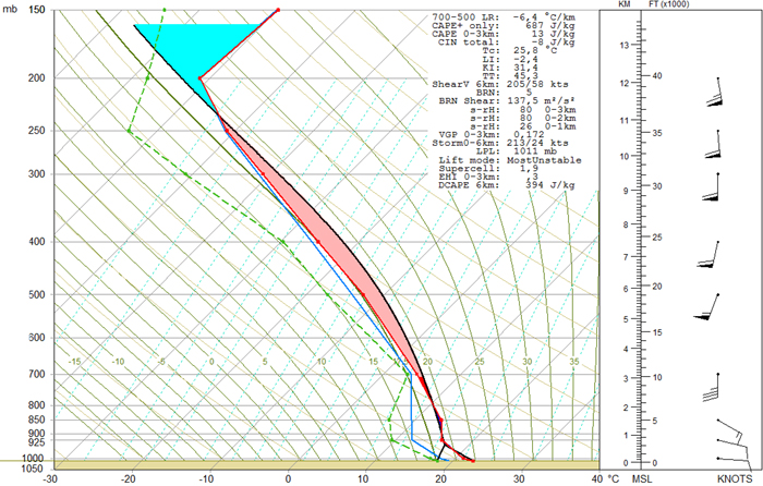 - Large convective inhibition, which will prevent initiation unless a significant forcing available. CIN will decrease with time as a result of low level advections. Also, a mesoscale forcing source will arrive in place at 15 UTC, as we know now, after the event.