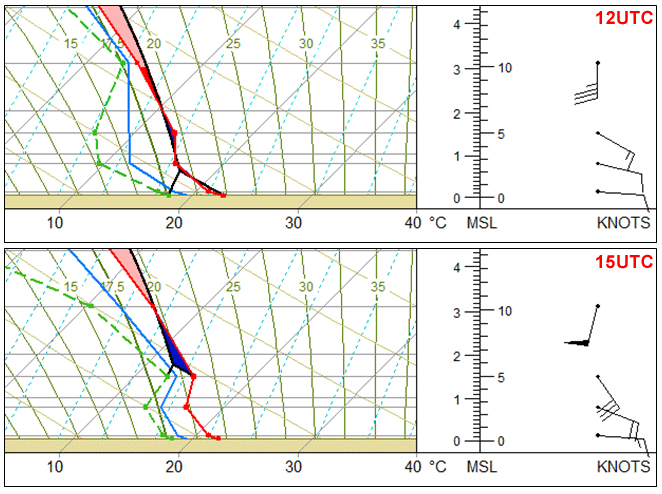 Figure 4.4: Zoom to the lower layers of troposphere. ECMWF analysis (12Z) (top) and 3 hour forecasted (15Z) soundings (bottom)