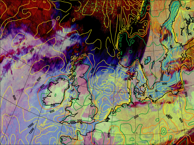 Meteosat 8 Night Microphysical RGB; Boundary Layer Height in metres (yellow: height 600 metres or more; orange: height 400 m; green: 200 metres or below) .