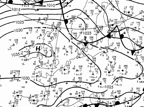 Anticyclone centered over the British Isles. Frontal clouds in the north and west seen as dark red-black in night-time RGB, as cyan-whitein daytime RGB. The low clouds seen as greenish against pinkish cloud-free areas. In daytime images the HRV channels show the edges of the clouds quite precisely over the UK.
