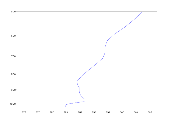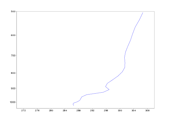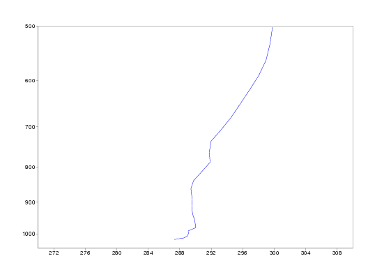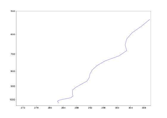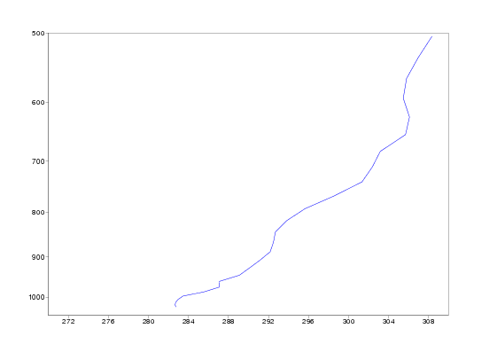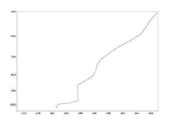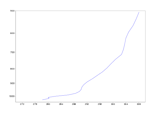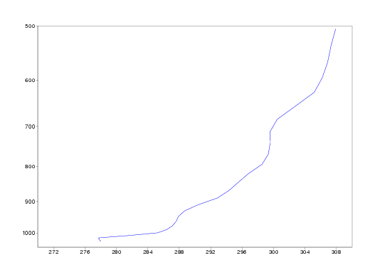 Isentropes are in the beginning of the period featureless, but on 20 December a marked stable area developes around 1000 hPa over England. On 22 December the stability is at maximum, but on 23 december the stable layer suddenly is elevated up to 950 hPa. This happens in the conjunction with lifting of the fog. Corresponding vertical profiles of Thetae for Heathrow show the development of highly stable layer even better. Note also the dramatic rise in Thetae on 23 december afternoon.