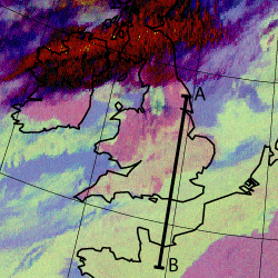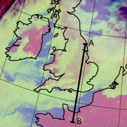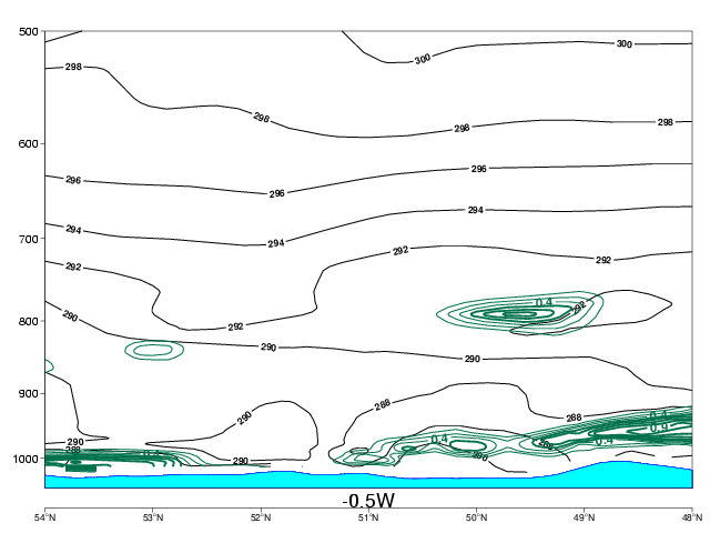 Cloud Cover VCS shows interesting features, particularly on the last day of the event. We can see mostly very low-level cloudiness analysed in the model, quite well agreeing with the observed cloudiness in satellite images. Cloud cover clearly is trapped beneath the inversion. On 23 Dec at 00 UTC another cloud layer at 900-950 hPa south seems to be advected on top of the fog layer in SE England from south; it is quite possible that this cloud layer inhibits the IR cooling of the fog layer beneath and supports the lifting of fog and mixing of boundary-layer air.
