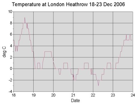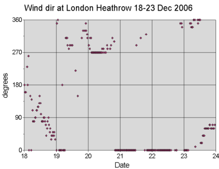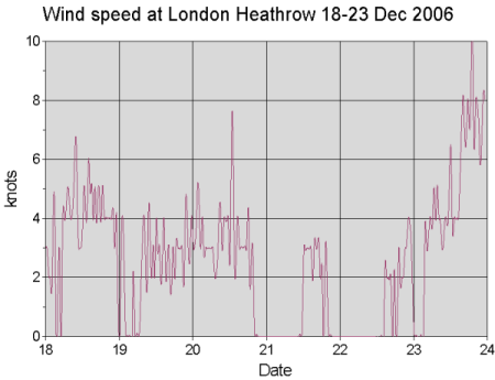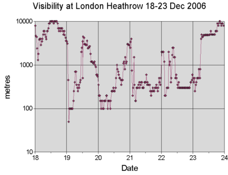 In the graphs below are shown the (horizontal) visibility observations, wind direction and wind speed at London Heathrow 18-23 December (half-hourly METAR Observations). We can identify the following stages: