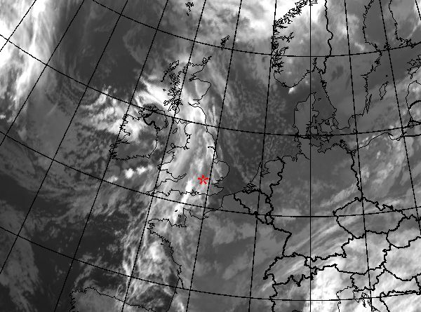 18 December 2006/00 UTC Meteosat 8 IR10.8 image. Location of London shown with a red asterisk.