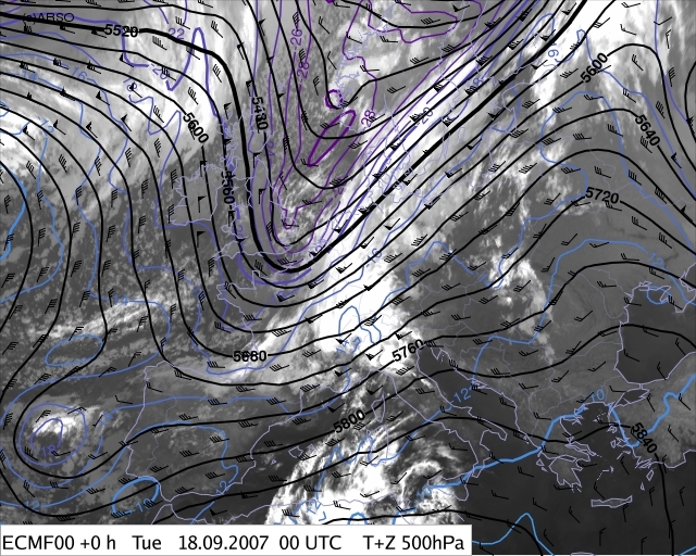 A deep upper-level trough, presented by the isolines of 500hPa height in black, is located over the west coasts of Europe. There is