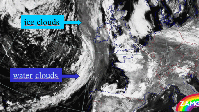 A product that can be used day and night is the difference between two infrared channels: 10.8 µm – 12.0 µm. In the 10,8 µm channel the absorption levels are the same for both water and ice, but 12,0 µm is absorbed slightly more strongly in the ice phase. The difference is too small to be actually seen by comparing the images, but it can be revealed clearly when the two channels are subtracted.