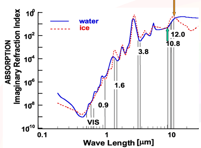 Fig. 3.4. Imaginary refractive index for water and ice as a function of wave length/µm. The green and orange arrows show the absorption for the wavelenghts 10,8 µm and 12,0 µm.