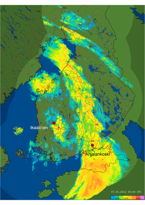 Fig.6.7. Combination image of Finnish radars 7th Jan. 2011 00.00 UTC, with color scale