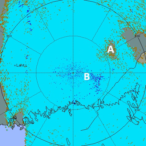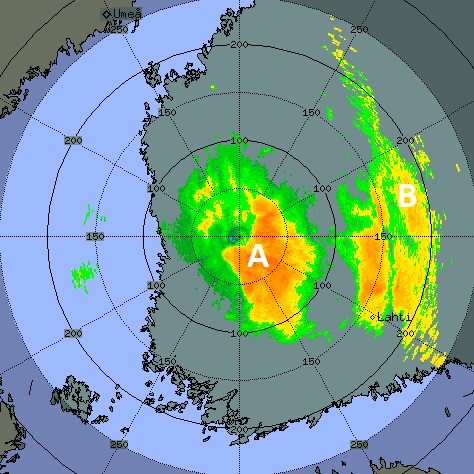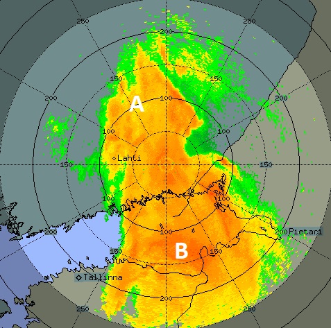 In this image, which is a combination of several radars, you see the CAPPI echoes and the locations of the Ikaalinen and Anjalankoski radars. After that, there are CAPPI and HCLASS images from both radars. With this information, you should choose the areas where supercooled water might be present.