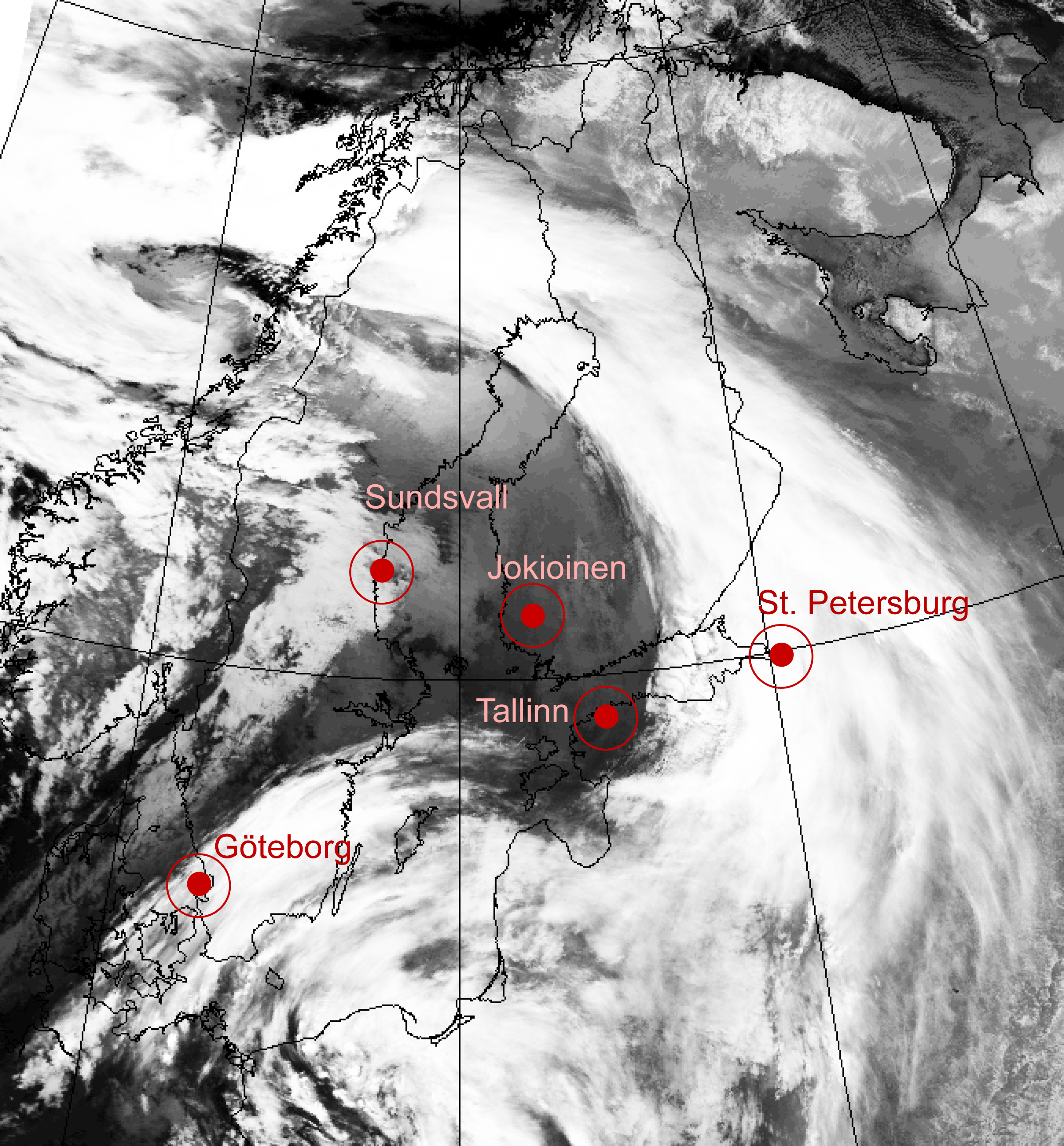 In this exercise you will examine the cloudiness in five places. From the IR image in fig. 6.3. you can roughly see the height of the clouds, but the soundings reveal the cloudiness in more detail. The locations of the soundings are marked with a red cicrle. When you click over a circle, the corresponding sounding appears.