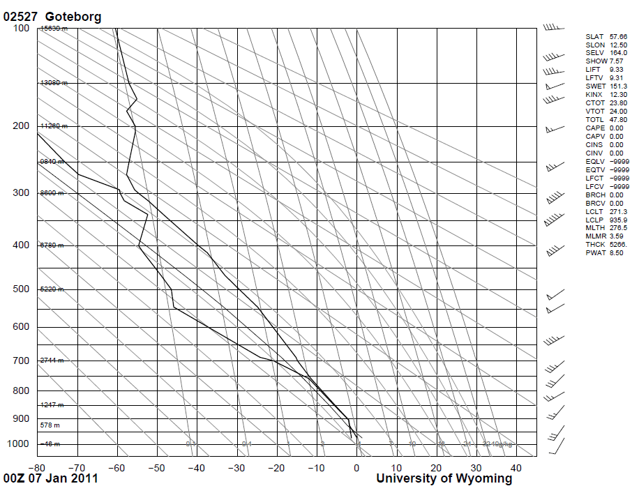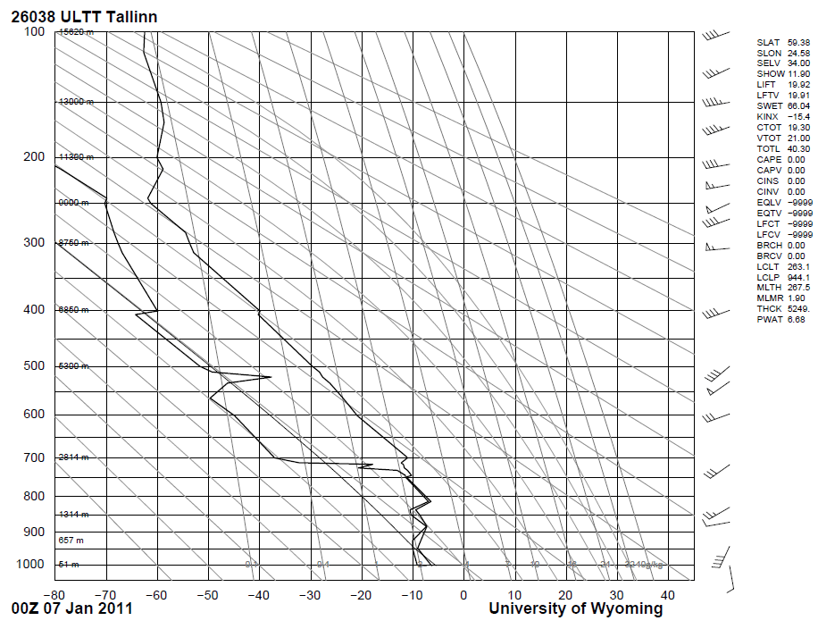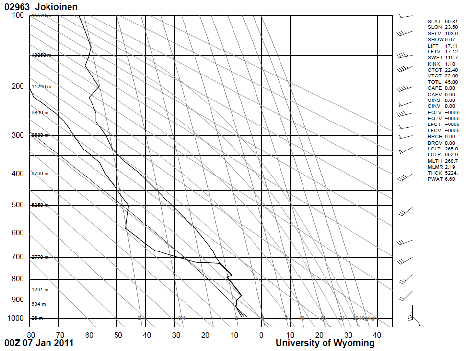 In this exercise your task is to find possible icing conditions in a part of Northern Europe on the 7th of January 2011 around 00 UTC. The exercise contains four parts: knowledge of cloud phases, soundings, satellite images and radar images.