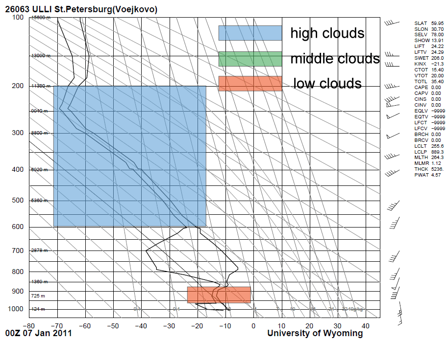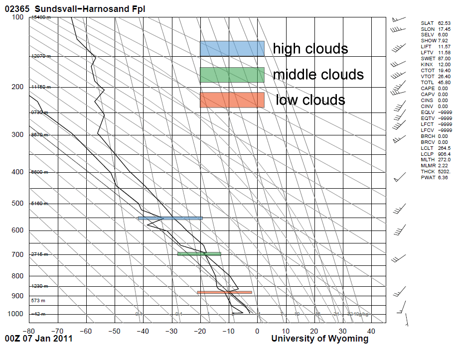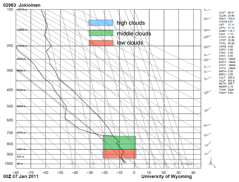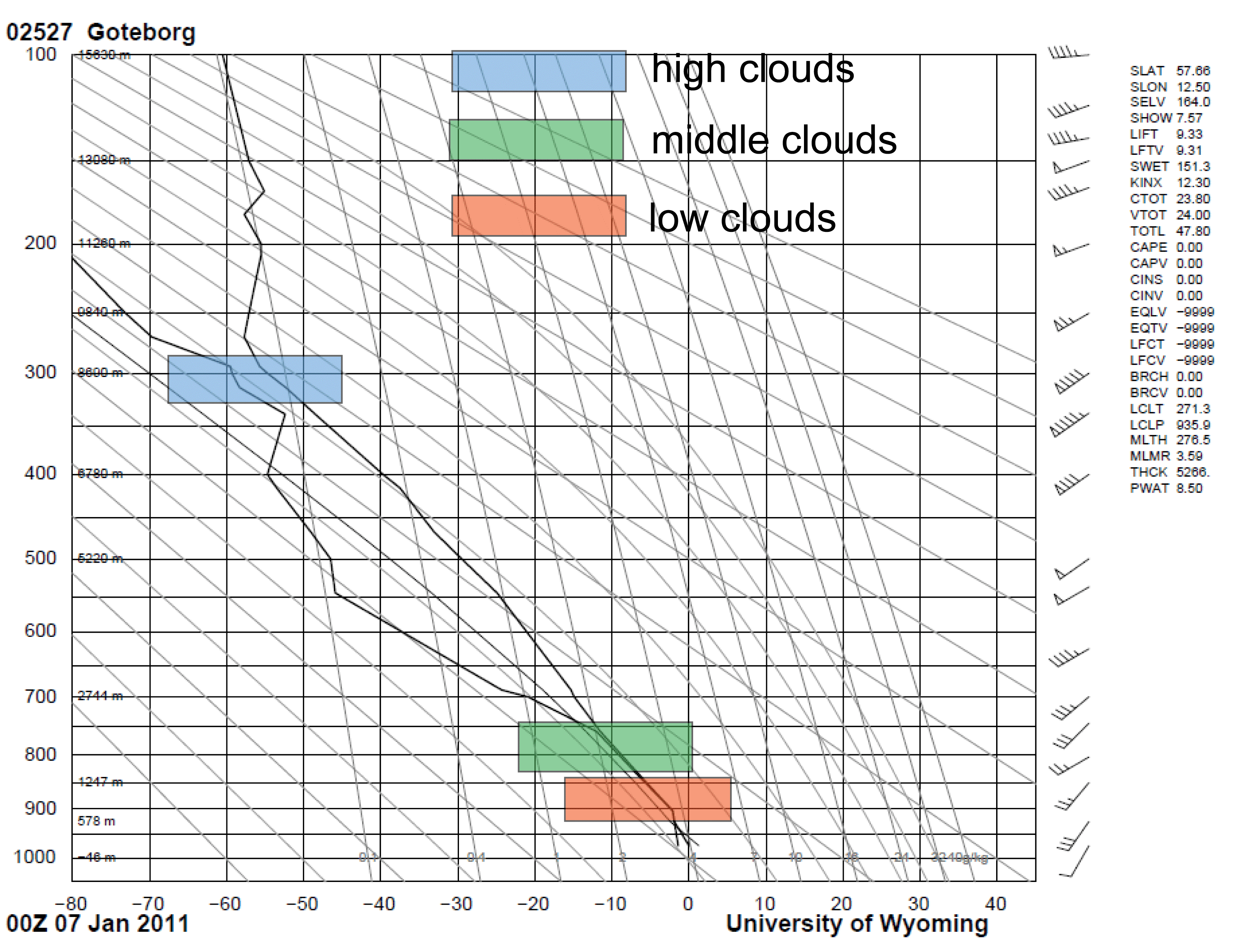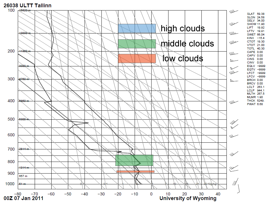 Fill in the following tables with the help of the data revealed from the soundings. Generally, the classification of clouds according to their height depends on the latitude, clouds generally forming at lower levels in high latitudes than lower ones, but in this case a rule of thumb would be as follows: