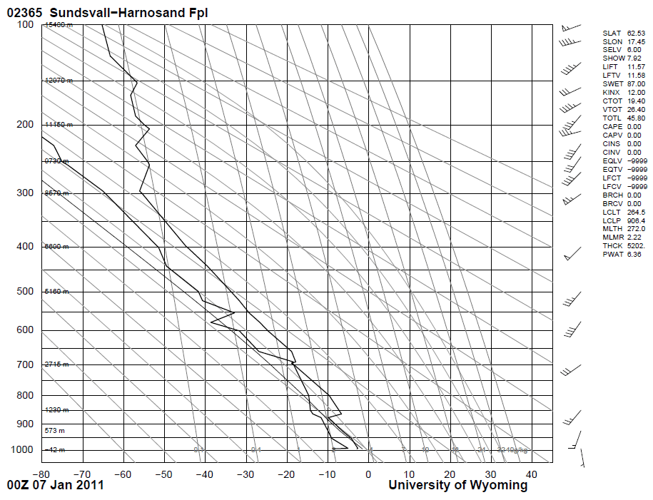 The synoptical situation on the 7th January 2011 at 00 UTC is such that a warm occlusion reaching from Northern Sweden through Western Finland to the Baltic Countries is moving slowly northwards: