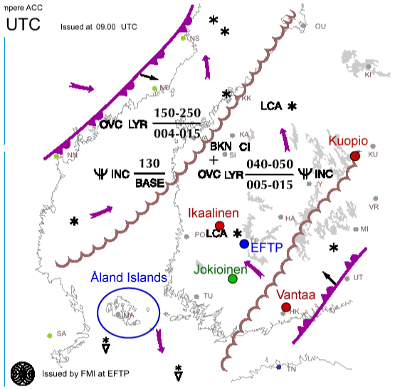 Fig. 5.1. Significant Weather Chart for Western Finland by FMI 10th Nov 2010 for 06 UTC. Airports are marked blue, radars green.