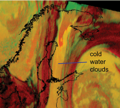 In Meteo France´s icing cloud product different meteosat images are converted into an interpretation where the possible icing clouds are revealed by excluding semi-transparent clouds, too cold or too warm clouds and ice-top clouds. The icing clouds appear red in the image: