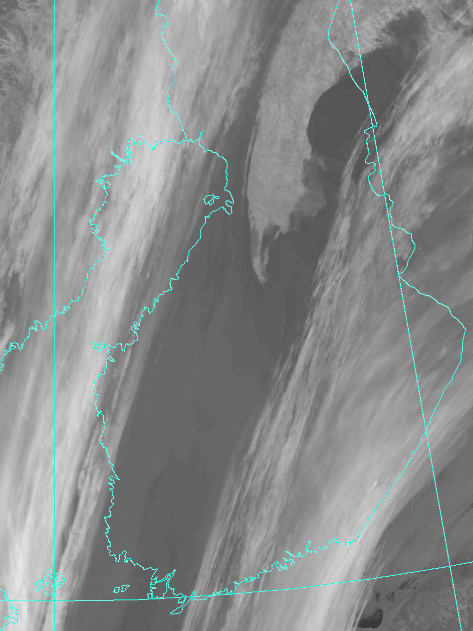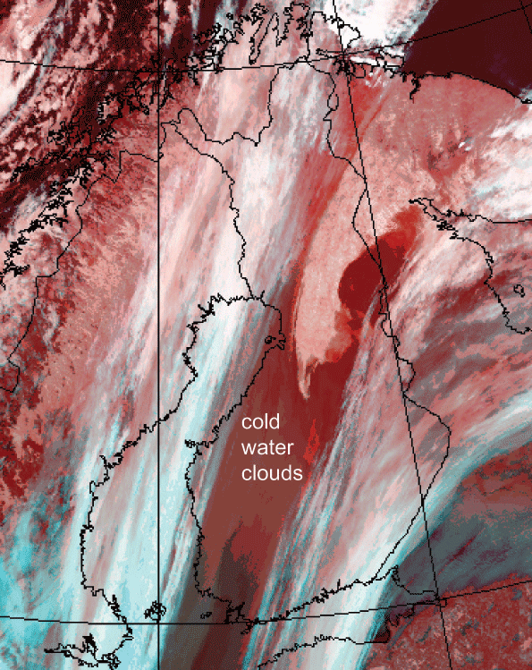 (3,7 µm + 10,9 µm + 12,0µm). The stratiform cloud is clearly seen between the high frontal clouds (whitish), but as the ice cloud over Eastern Finland appears pinkish, there might well be water clouds beneath it.