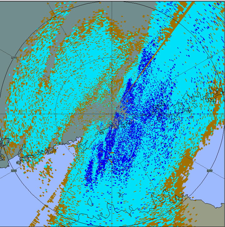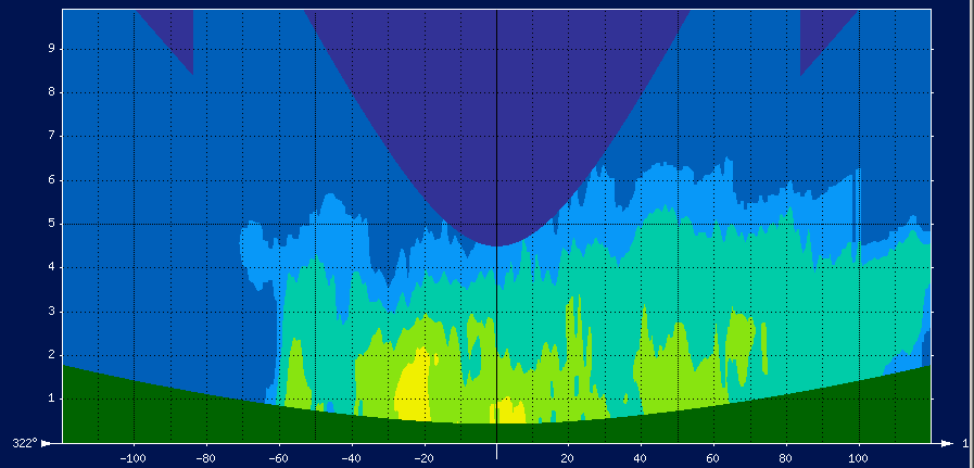 Fig. 5.16.a. Cross section from the Kuopio radar 30. Dec 2010 at 13.15 UTC, with color scale