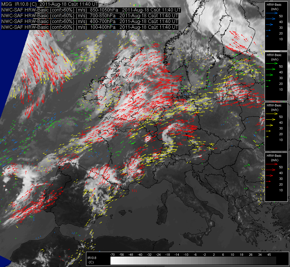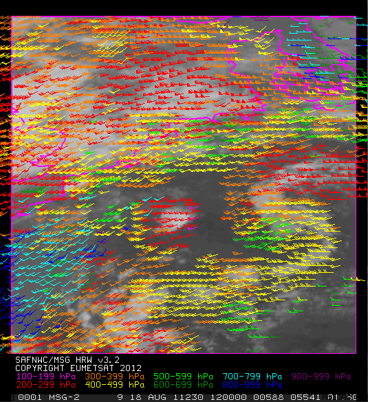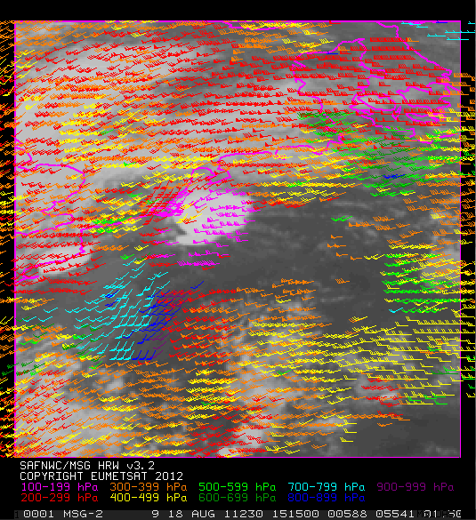 Wind field can be retrieved from satellite imagery. Fig. 4.3 and the corresponding animation show the NWCSAF High Resolution Wind (HRW) product. Vectors with different colors indicate retrieved winds in different pressure layers. This product supports the ECMWF analysis and forecasts shown in the 'Synoptic situation description' chapter, which indicate that the main wind direction in the studied area was southwesterly.