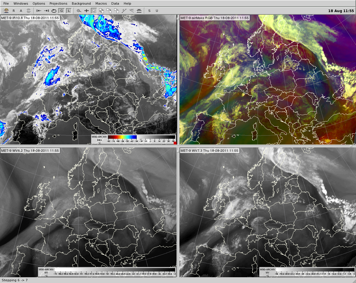 Fig. 4.1. Meteosat-9 images for 11:55 UTC. IR10.8 (upper left), airmass RGB (upper right), WV6.2 (below left) and WV7.3 (below right)