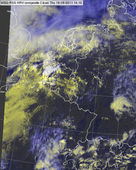 Fig. 4.2. Meteosat-8 HRV cloud RGB images, 14:10 UTC (left) and 15:00 UTC (right)