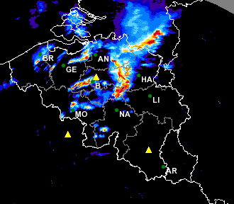 The radar imagery showed a bow echo in the studied storm system at several time steps. At 15:55 UTC it was located between Brussels and Hasselt (Fig. 5.1 left panel, Brussels and Hasselt are indicated by 'B' and 'HA' on the map). 45 minutes later, about the time when the windstorm hit the festival, this bow echo was even more folded around Hasselt (Fig. 5.1 right panels).