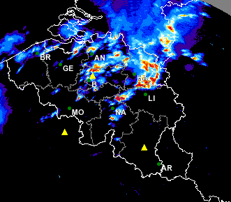 Fig. 5.1. Radar column maximum product for 15:55 UTC (left) and for 16:40 UTC (right). Composite image of two radar measurements. Source: RMI