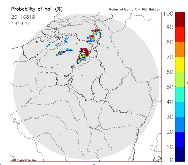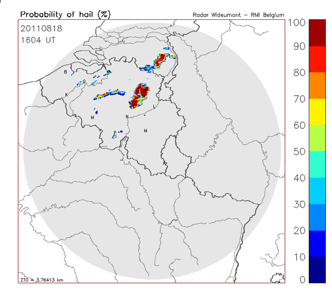 Fig. 5.2. Probability of hail retrieved from radar data for 16:04 UTC (left) and 16:19 UTC (right), source RMI