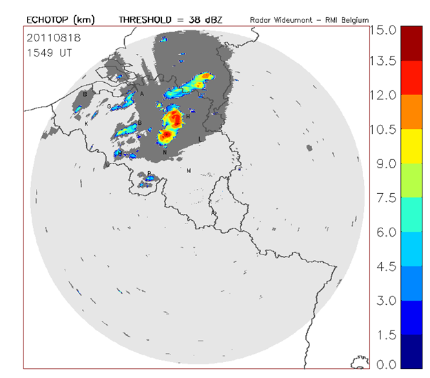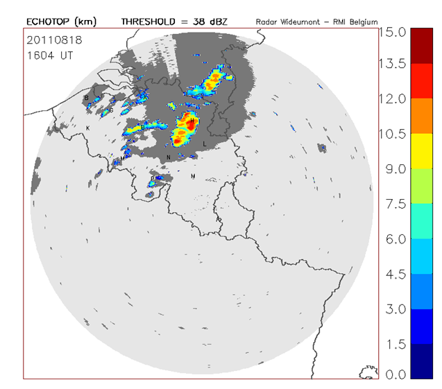 Fig. 5.3 Echotop radar product for 15:49 UTC (left) and 16:04 UTC (right), source: RMI