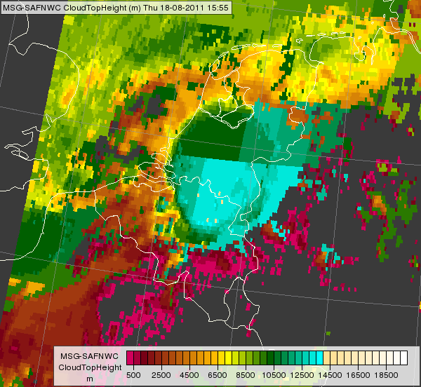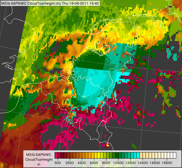 For comparison we present the satellite-retrieved cloud top height product of NWCSAF (Fig. 5.5). Here the cyan color corresponds to a height of 13,2 km.