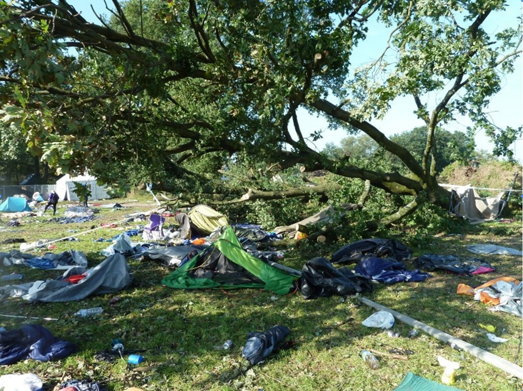 At 18 August 2011 a severe thunderstorm system developed over Belgium. It initiated over France and then passed over Belgium, the Netherlands and Germany. The studied thunderstorm grew fast and was long-lived. It was extremely severe; particularly the downdraft was extremely strong. The most intense part of the windstorm hit the Pukkelpop festival organized close to the city of Hasselt. There were 60 thousand people at the festival, staying mainly at the camping site. The strong wind flattened tents, uprooted trees, brought down festival light towers and TV screens, and caused a stage to collapse. Five people were killed and 140 people injured in the storm, ten of them seriously.
