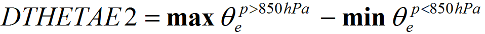 Fig. 2.5b. As in 2.5a but for the DTHETAE2 parameter (colors) and equivalent potential temperature (grey solid lines) and wind (arrows) at 700 hPa.