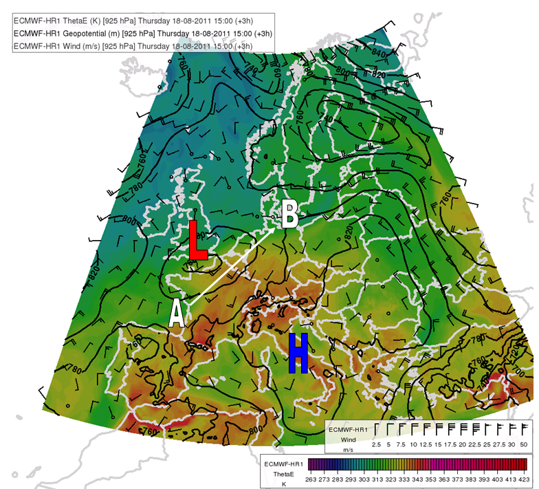 Fig. 2.3. ECMWF 3 hour forecast for 18 August 2011 15 UTC. Equivalent potential temperature (colors), geopotential height (black lines) and wind barbs for 925 hPa. The white arrow and the A and B letters indicate the sense of the vertical cross section analyzed in the next figure. The letters H and L indicate highs and lows in the geopotential field.