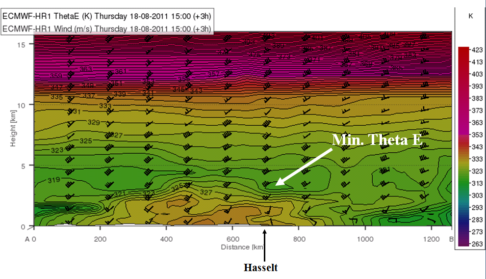 Fig. 2.4. ECMWF 3 hour forecast for 18 August 2011 15 UTC shown along the vertical cross section indicated in Fig 2.3. Equivalent potential temperature (colors and black contours) and wind barbs.
