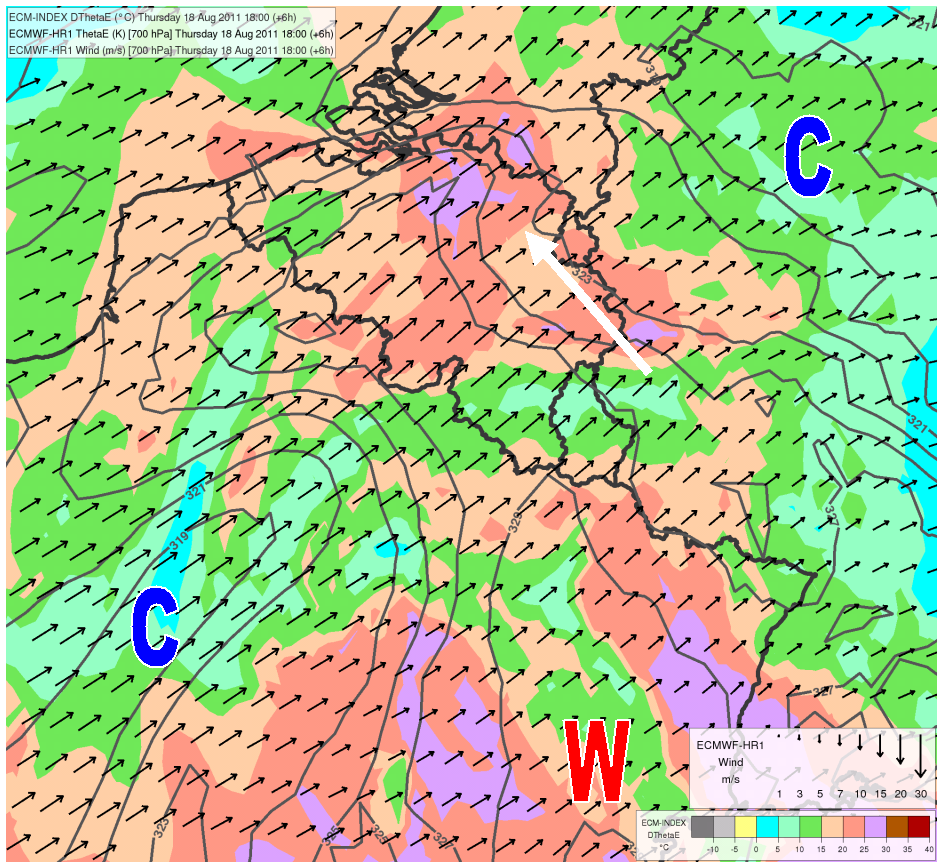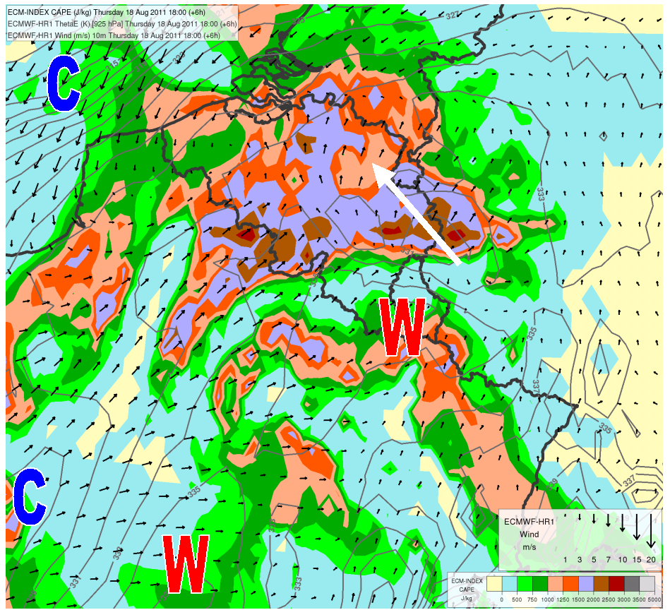 Fig. 2.5a. ECMWF 6-hourly forecast for 18 August 2011 18 UTC. ECMWF derived indices: surface based CAPE (SBCAPE) (colors) and equivalent potential temperature at 925 hPa (gray solid lines). The letters C and W indicate minima and maxima, respectively, of the equivalent potential temperature field. Arrows depict the 10 m wind. The big arrow indicates the location of the city of Hasselt.
