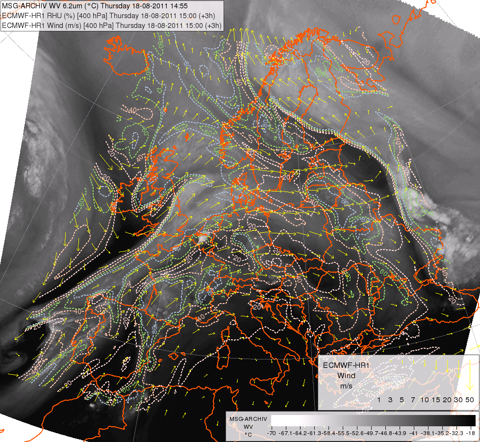The 6.2 and 7.3 µm water vapour channels of the METEOSAT-9 satellite provide observational evidence of dry air in the upper and mid-levels of the troposphere. The satellite imagery was combined with relative humidity fields from the ECMWF model (Fig. 2.6). Dark stripes in the water vapour images seem to be closely related to areas of dry air in the ECMWF forecasts for 400 and 600 hPa, respectively. The environmental dryness at the 600 hPa level (relative humidity well below 30 %) might be important because it is often expected (e.g. by computation of the Downdraft Convective Available Potential Energy, DCAPE) that thunderstorm downdrafts initiate at this height.