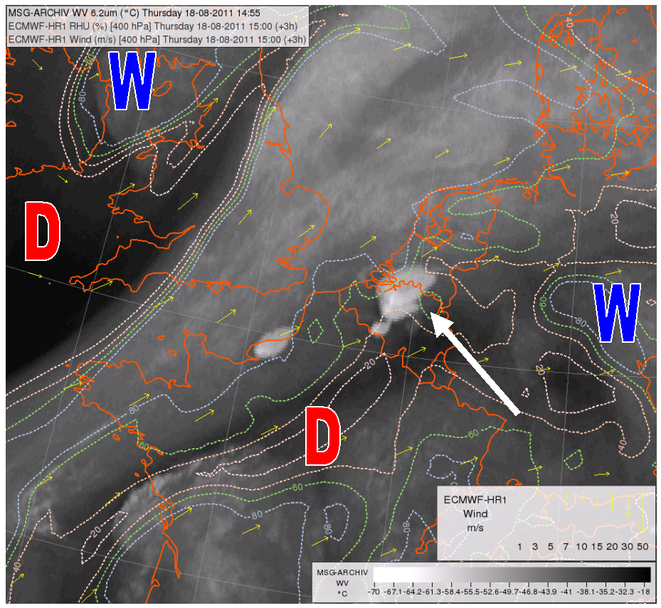 Fig. 2.6a. Meteosat-9 WV6.2 image for 14:55 UTC overlaid by 3 hour ECMWF forecast for 15 UTC: relative humidity (colored dashed lines) and wind (arrows) at 400 hPa for the whole of Europe (left) and in a close-up look (right). The areas with relative humidity exceeding 80 % and below 20 % are shown by the letters W and D, respectively. The arrow indicates the location of Hasselt.