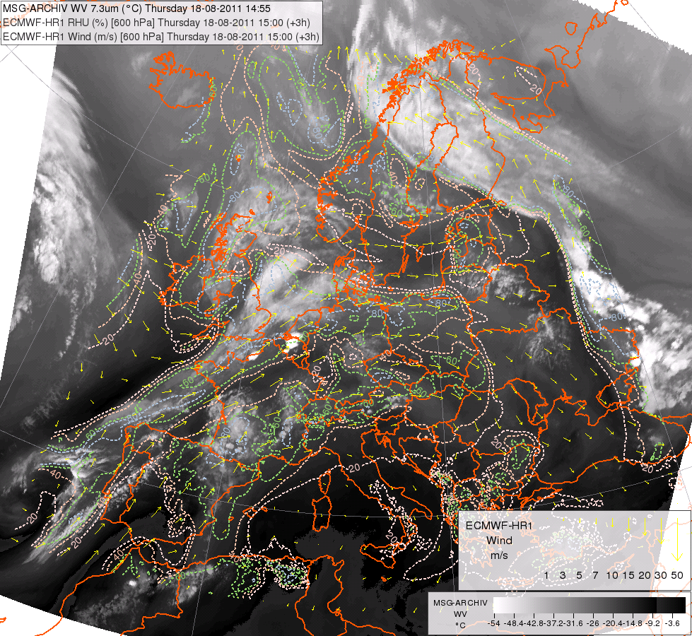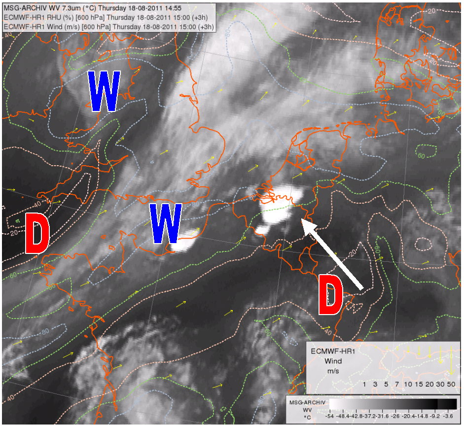 Fig. 26b. Meteosat-9 WV7.3 image for 14:55 UTC overlaid by 3 hour ECMWF forecast for 15 UTC: relative humidity (colored dashed lines) and wind (arrows) at 600 hPa for the whole of Europe (left) and in a close-up look (right). The areas with relative humidity exceeding 80 % and below 20 % are shown by the letters W and D, respectively. The arrow indicates the location of Hasselt.