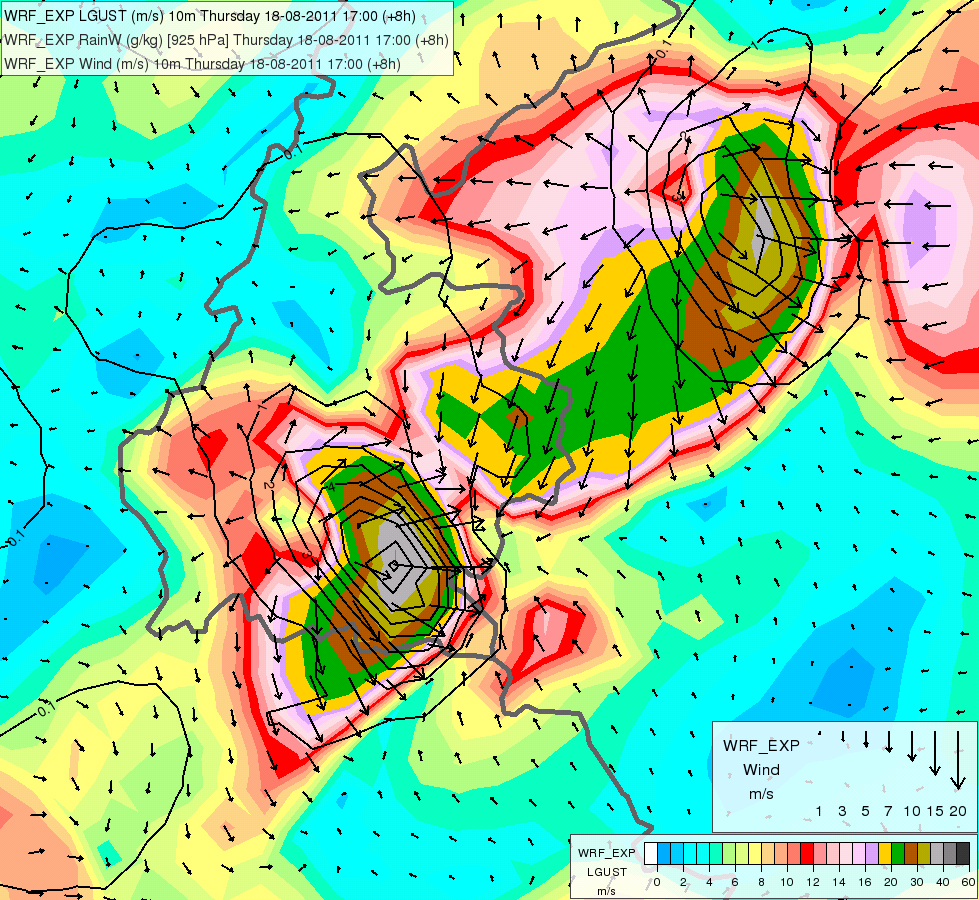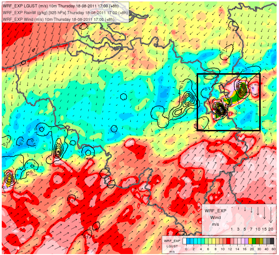 Fig. 3.2. WRF 8 h forecasts for 18 August 2011 17 UTC: wind gust-speed at 10 m (colors), rain water at 925 hPa (black lines) and wind vectors at 10 m. The zoomed area (rectangle) of the investigated cell is shown on the right of the image.