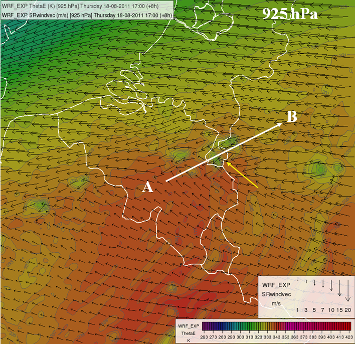 Fig. 3.3. WRF 8 h forecast for 18 August 2011 17 UTC: equivalent potential temperature (colors and gray contours) and storm relative wind vectors at 925 hPa (above) and 600 hPa (below). The white arrow and the A and B letters indicate the location of the vertical cross section analyzed in the next figure. The yellow arrow shows the direction of the storm relative inflow. The dashed white line in the panel below shows a 'tongue' of low equivalent potential temperature.