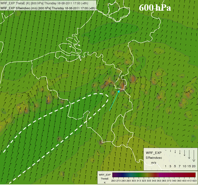 The main environment characteristics in the WRF simulation are similar to those forecast by ECMWF (which provided boundary and initial conditions for the WRF model). There was a southeasterly-easterly storm-relative inflow of warm and moist air at low levels (Fig. 3.3). The thunderstorms produced rather isolated outflows, which can be observed as local minima in the field of the equivalent potential temperature. A larger cold pool developed only in the forecast valid for 18 UTC over the west of Germany (not shown). At mid-levels (600 hPa), there was a "tongue" of dry air spreading from France toward the thunderstorm. In this level, the local maxima of the equivalent potential temperature are areas of the thunderstorm updrafts, which transport the moist air to the upper levels.